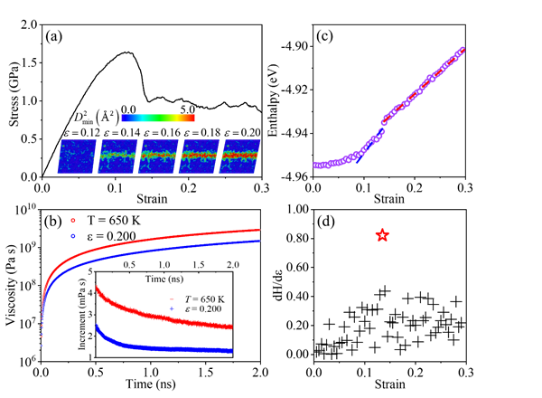 图1.非晶合金剪切带涌现与玻璃-液体转变的相似性。(a)应力-应变曲线与不均匀变形场;(b)成熟剪切带内的粘度计算;(c)加载过程焓随应变的演化,剪切带涌现前出现焓-应变一阶导不连续;(d)焓-应变一阶导随应变的演化,突变处类似玻璃转变过程中的比热台阶。