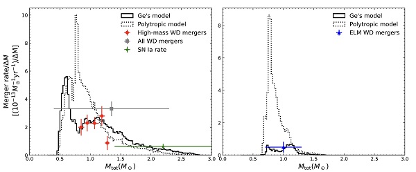 基于最新的物质转移稳定性判据,科研人员构造了银河系内双白矮星星族。理论计算表明,Ge模型可以更好地重现观测双白矮星的并合率分布(图2左)以及含有极低质量白矮星的双星并合率分布(图2右)。此外,研究发现,利用新的物质转移稳定性判据可以较好地解决早期理论模型中双白矮星空间密度与观测不符的矛盾。在此基础上,科研人员进一步探究了双白矮星并合对Ia型超新星的影响及双白矮星的引力波辐射性质,为相应观测提供了理论支撑。该工作证实物质转移稳定性对双白矮星星族的影响是决定性的。新的物质转移稳定性判据更好地支持观测约束。