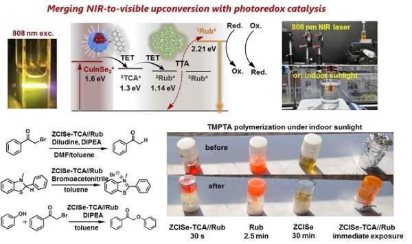 此外,该工作进一步将该上转换体系与有机光催化融合,将上转换产生的红荧烯单线态直接用于“原位”有机氧化、还原、光聚合等反应。该设计巧妙避免了上转换光子传播至溶液表面所经历的量子点重吸收损失。此外,得益于近红外光子的有效利用和量子点的宽谱吸收特性,该上转换-有机催化融合体系可在太阳光下高效快速运行,在室内窗台上(光照强度约32 mW cm-2)几秒内即可实现丙烯酸酯的光诱导聚合。