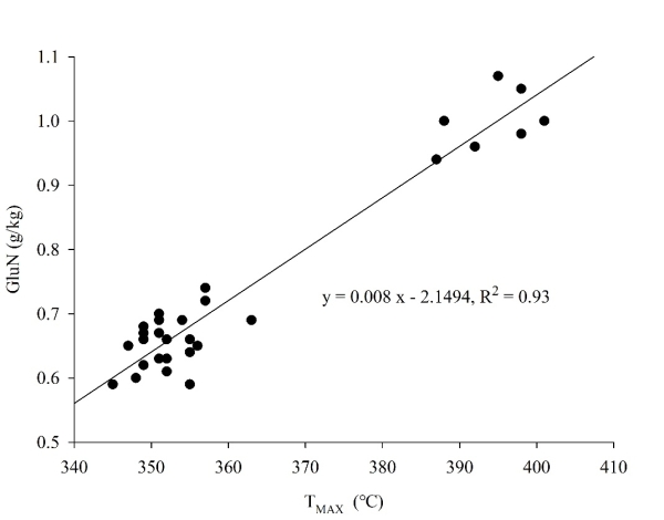 中国科学院东北地理与农业生态研究所研究人员依托保护性耕作长期定位实验(建于2001年)在国内首次开展了相关研究,包含免耕玉米-大豆轮作(NTCS)、秋翻玉米-大豆轮作(MPCS)、免耕玉米连作(NTCC)、秋翻玉米连作(MPCC)、常规耕作玉米连作且秸秆不还田(CTCC)5个处理。该研究采集了不同深度的土壤样品,测定其土壤热稳定性(图1),计算RE相关指标,同时与土壤异养呼吸及微生物残体进行相关分析。RE方法分为热解和氧化两个阶段,包括S1-S5五个阶段,具有多个相关指标,TMAX(℃)代表在S2热解阶段释放的富氢化合物达到峰值时对应的温度,可作为指示土壤有机碳成熟度的指标。HI表示在土壤有机碳中富氢化合物的相对含量,OIRE6表示在土壤有机碳在S3阶段释放的O2相对含量,代表土壤有机碳的相对氧化状态。T50代表在氧化阶段(S4)释放的CO2达到该部分总释放值50%时的温度,用来表征稳定性碳库。研究结果表明,耕作方式对RE指标影响很大(TMAX、HI、T50),但是作物轮作对其无显著影响,其中免耕显著提高了土壤表层的有机碳热稳定性(TMAX)。RE指标(HI)在短期室内培养实验中(<100天)可以很好地表征土壤异养呼吸情况,也在国际上首次发现TMAX指标与真菌残体(GluN)有很高的相关性(R2=0.93)(图2)。该研究为未来RE方法在国际上的推广应用提供了有效的数据支撑。