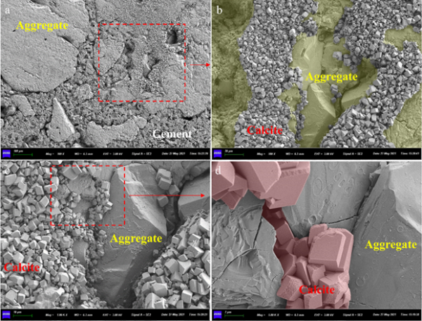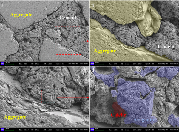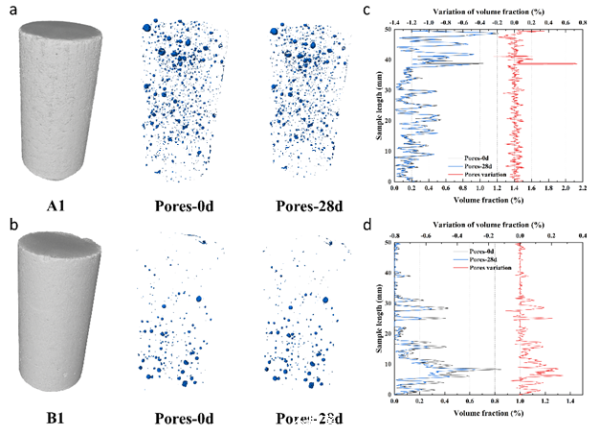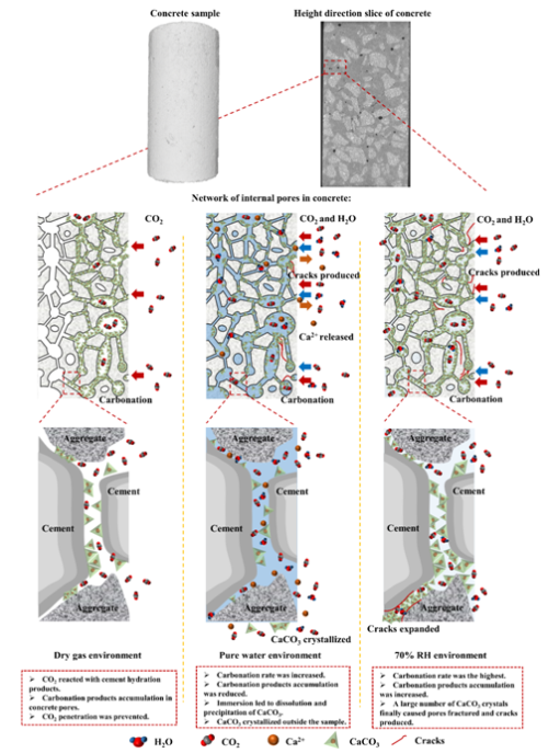 中国科学院武汉岩土力学研究所利用高压CO2对混凝土进行不同碳化环境研究,利用X射线衍射(XRD)、扫描电子显微镜(SEM)与微米CT(μ-CT)进行分析表征,获得了混凝土碳化前后的物相组成与孔隙结构的变化,并在此基础上对混凝土碳化前后的抗压强度进行研究。由微米CT表征结果可知,不论是何种碳化环境,由于碳化产物在孔隙中堆积,碳化后混凝土的孔隙度有较为显著的降低,且孔隙越密集区域孔隙的减小量越大。而物相分析与SEM结果发现,碳化环境对碳化产物结晶过程产生影响,水的存在增强了混凝土碳化,促使碳化产物除方解石外还有大量文石产生。低浓度CO2碳化增强混凝土强度,而在水的作用下高浓度CO2诱发混凝土过度碳化,造成混凝土内部微裂缝的产生与扩展,其强度随碳化时间先增大后减小,并于碳化28天后强度低于未碳化混凝土。