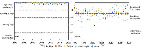 图2 1990年至2019年塔里木河流域水-能源-碳排放系统耦合(a)和协调度(b)变化趋势