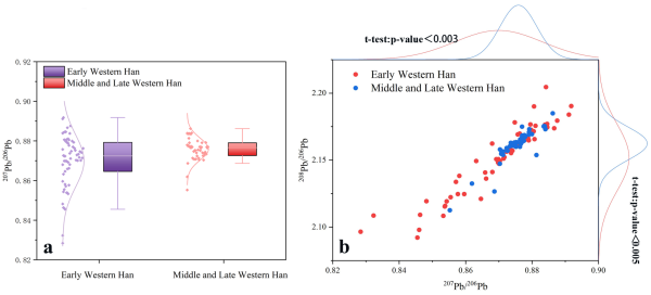 图2.西汉早期和中晚期铜器铅同位素的箱式图和组边际图