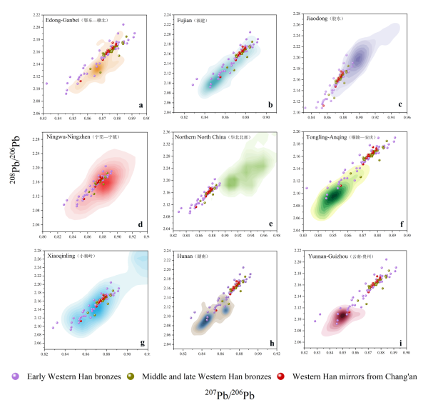 图3.汉代青铜器和各地区铅矿的铅同位素核密度图