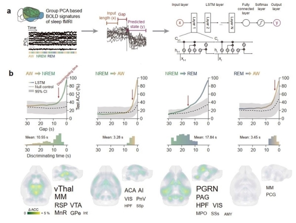 图2.使用LSTM RNN模型预测睡眠觉醒状态转换方向。(a)LSTM RNN模型的计算流程;(b)模型随间隔时间变化的预测精度及与大脑状态预测相关的脑区。