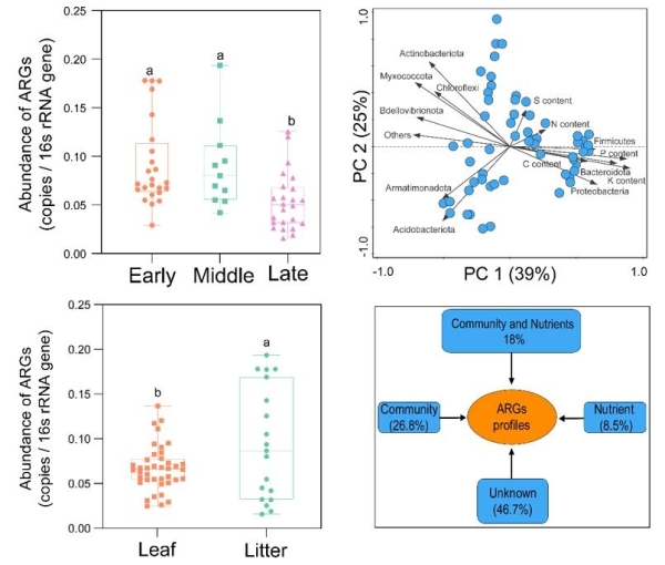 抗生素抗性基因(ARGs)的传播已对人类健康构成威胁。尽管植物叶际代表了一个重要的微生物库,但人们对人类干扰较少的自然生境中ARGs的分布和驱动因素知之甚少。因此,科研人员收集了植被演替序列中的早期、中期和晚期的植物叶片样本,以探讨植物叶际ARGs在自然生境中分布概况。该研究测定了植物圈ARGs、细菌群落和叶片营养物含量,以评估它们对植物圈ARGs的贡献。研究确定了151种独特的ARGs,涵盖了几乎所有公认的主要抗生素类别。研究进一步发现,在植物群落演替过程中,由于植物群落生境的波动和植物个体的特定选择效应,植物叶际ARGs存在一些随机性和核心组。在植物群落演替过程中,由于植物叶际细菌多样性、群落复杂性和叶片营养成分的减少,ARGs丰度明显下降。而土壤和落叶之间的密切联系导致落叶中的ARGs丰度高于鲜叶。研究显示,自然环境中的植物叶际蕴藏着广泛的ARGs。这些植物圈ARGs分布由各种环境因素驱动,包括植物群落组成、宿主叶片特性和植物圈微生物组。