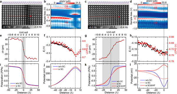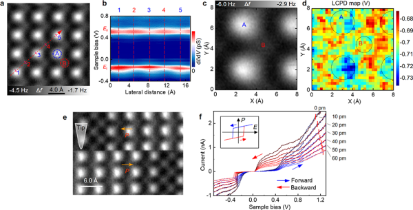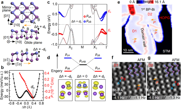 科研人员在具有石墨表面上生长制备了高质量的单层BP-Bi样品,由于石墨表面与BP-Bi之间为较弱的范德华相互作用,使得BP-Bi能保持本征特性,便于后续原子级物性表征和调控。研究利用qPlus原子力显微镜对BP-Bi进行实空间成像,并结合开尔文探针显微镜(KPFM)测量,分别确定了BP-Bi的翘曲原子构型以及子晶格之间的电荷重整化,因而证实了单层BP-Bi存在面内有序电偶极矩排列。结合理论计算,研究发现,BP-Bi的原子结构翘曲程度决定铁电极化,并影响材料的基本能带结构,从而在BP-Bi中造就了电子结构和铁电极化之间相互锁定的奇异现象。这种新型铁电性的发现为利用外电场调控铁电畸变对材料的其他新奇性质进行调控提供了可能。进一步,研究利用扫描探针产生的面内电场对BP-Bi的电极化进行了翻转操作,这正是非易失性存储器件实现数据写入的功能基础。