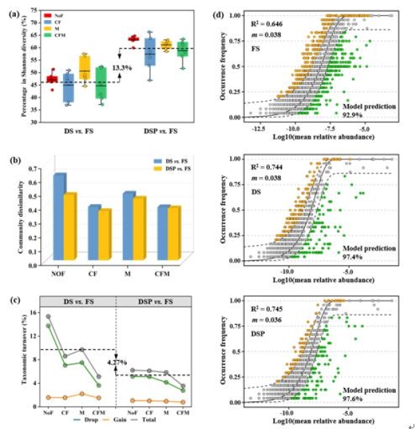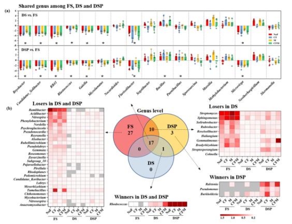 研究结果表明,长期干燥保存对土壤细菌多样性和群落结构产生显著影响,自然风干土壤中细菌群落多样性是冻存土的46.8%,而去除relic DNA后的风干土壤细菌多样性恢复了13.3%且明显减小了与冻存土细菌群落结构的差异(图1)。风干土壤保存了超过90%序列数的细菌门,但在属水平上细菌对干燥压力产生差异性应对策略(图2)。尽管如此,土壤干燥保存没有显著改变长期施肥对土壤细菌多样性、群落结构和群落抗性影响的遗留效应,即长期化肥添加显著改变了细菌群落结构且降低了细菌群落多样性。此外,土壤干燥保存减弱了细菌共线性网络结构的稳定性,但去除relic DNA后的风干土壤明显恢复了微生物网络特性。该研究提出了利用PMA核酸染料去除土壤中relic DNA的方法,可改善长期干燥保存对土壤微生物群落的负面影响,同时施肥对土壤细菌的遗留效应在保存长达7年的风干土壤中仍可检测到,表明长期保存的历史土壤样品或可用于不同农业管理下土壤微生物分子生态学研究。
