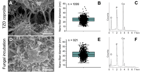 结果表明,驼子洞采集的粪化石来自于鬣狗这类凶猛捕食者。更有意思的是,粪化石多由纳米级别的羟基磷灰石纤维所构成,其直径约30 nm。这类纳米级别羟基磷灰石纤维的透射电镜特征和形态特征表明,它们不太可能代表骨质材料的骨胶原纤维,并排除它们是矿化微生物细菌的可能性。而研究人员在由细菌诱导所矿化形成的化石材料中,几乎没有观察到过这类纳米级别的羟基磷灰石纤维。科研人员通过查阅文献发现,土壤和喀斯特溶洞中大量存在因真菌新陈代谢而诱导形成的碳酸钙矿物,后者是纳米级别的矿物纤维。同时,文献报道动物粪便样品中存在大量的微生物,包括处于不同分类位置的细菌和真菌。