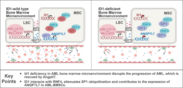 该研究揭示了骨髓微环境中ID1通过促进ANGPTL7的表达调控白血病的发生发展,揭示了AML细胞通过分泌BMP6促进骨髓微环境中ID1的表达。这条骨髓微环境和AML细胞相互影响的环路或对临床AML治疗具有指导意义。