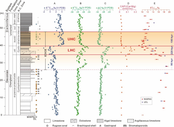 图1.四川龙门山泥盆系-石炭系界线剖面δ13Ccarb和δ13Corg记录、CAP含量和δ7Li记录