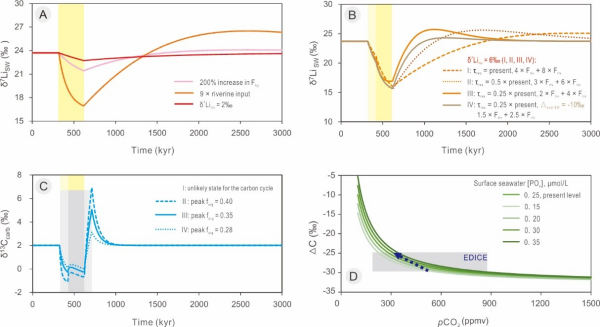 图2.泥盆纪-石炭纪之交海洋碳-锂循环模拟结果