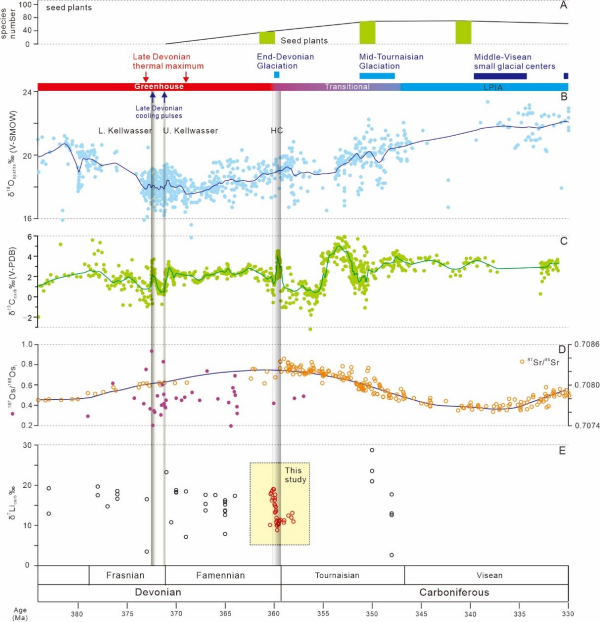关于该事件的诱因和机制,前人曾提出多种假说,如海洋缺氧、气候变冷、海平面快速升降、火山喷发以及多种环境因素综合作用等。部分学者则提出“泥盆纪植物假说”,即泥盆纪晚期陆地森林的大量出现和植物根系的发育,促进陆表风化作用和成土作用,改变地表径流及元素循环,大量营养元素的涌入导致海洋表层菌藻类繁盛、海水缺氧,最终导致海洋生态系统的崩溃。然而,这一复杂的海-陆-气相互作用目前停留在假说阶段。究其原因,该假说缺失大陆硅酸盐风化增强、营养盐供应增大这一关键一环的实质证据。