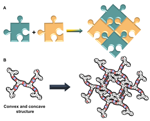 图1. 拼图的组装模式(A)和有机多孔分子晶体中类拼图的组装模式(B)