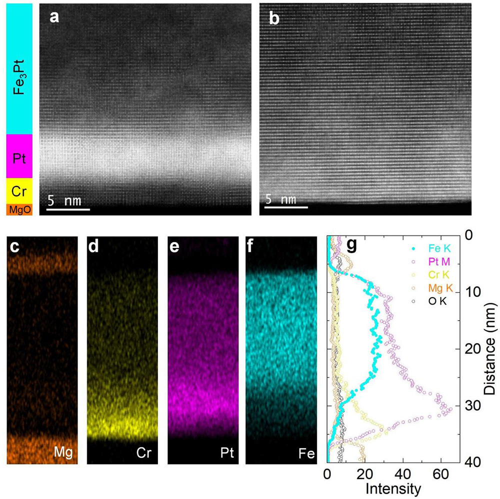 图2. a和b分别为L12与L10相Fe3Pt薄膜的高分辨场发射透射电子显微镜图像,c-f分别为Mg、Cr、Pt和 Fe的EDX图,g为L12相Fe3Pt成分元素空间分布图。
