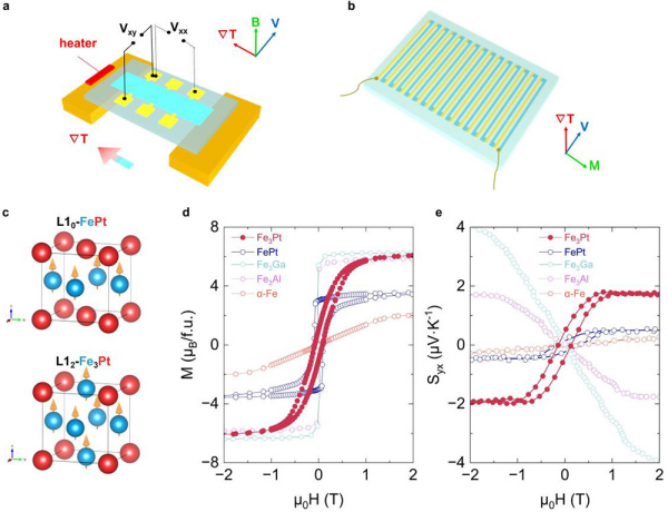 图1. a、ANE和塞贝克效应测试示意图;b、ANE微型热电转换装置演示图;c、FePt L10有序相(顶部)和Fe3Pt L12有序相(底部)的晶体结构(Fe原子为蓝色,Pt原子为红色;橙色箭头代表磁矩);d和e、磁化强度(M)和ANE系数Syx在室温下随磁场(μ0H)的变化曲线。