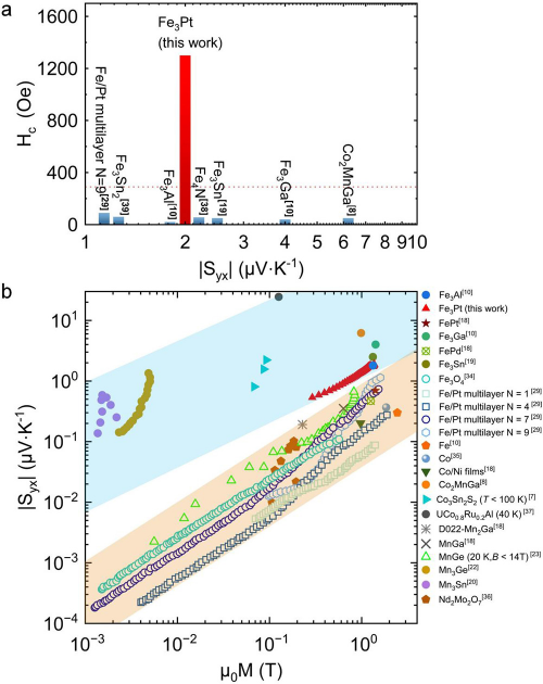 中国科学院物理研究所/北京凝聚态物理国家研究中心磁学国家重点实验室M03组沈保根院士团队,致力于新型永磁材料的研究。近期,该团队与怀柔研究部HM-T03组、理论室T03组以及先进材料实验室等合作,对Fe-Pt系永磁薄膜中的反常能斯特效应进行系统研究。研究表明,Fe3Pt合金薄膜在室温下具有反常能斯特效应(Syx ≈ 2 μV·K-1),约为Fe薄膜的10倍。此外,Fe3Pt薄膜具有较大的矫顽力(HC ≈ 1300 Oe)(图1e),在无外磁场下的新型热电器件方面展示应用潜力。