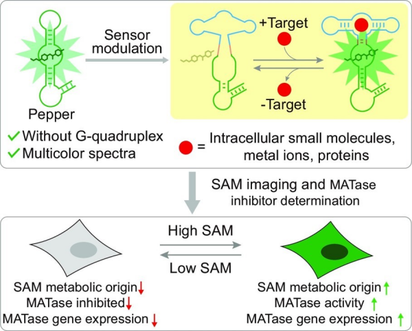 图1. 将Pepper改造为高性能荧光RNA传感器,检测细胞内靶标,监测细胞甲基化代谢通路与药物活性