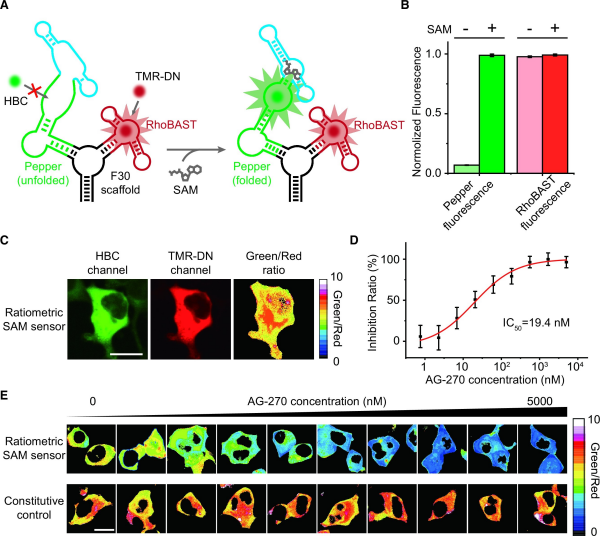该团队基于Pepper的生物传感器,探讨了甲基化代谢物S-腺苷甲硫氨酸(S-adenosyl methionine,SAM)代谢通路,测定了靶标药物活性。研究将Pepper与SAM适配体融合,构建出低背景、高响应、高选择性的SAM传感器。进一步,该工作探究了单细胞中SAM合成的代谢来源,解析了SAM合成酶(methionine adenosyltransferase,MATase)的酶活性和基因表达水平。此外,该工作还构建了监测SAM的比率传感器。该传感器精确定量了MATase的酶活性,并准确测定了MATase抑制剂AG-270的半抑制浓度(IC50)。该工作首次发展荧光RNA传感器来准确测定活细胞中的药物IC50,为研发基于RNA的药物筛选平台验证了可行性,并提供了高效的MATase酶药物筛选工具(图2)。