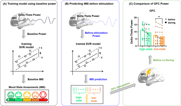 “正确的时间”指的是只有低情绪状态下调控OFC才能够有效改善情绪。研究进一步基于基线状态下OFC的delta-theta频段功率和情绪状态评分,并结合机器学习模型训练了情绪状态预测模型,在该模型中输入调控前个体OFC的delta-theta频段功率,预测个体当前情绪状态,发现只有个体处于低情绪状态时调控OFC才可有效抑制delta-theta频段功率,这反映了情绪状态的改善。这表明了iES调控OFC的最佳时机(图2)。