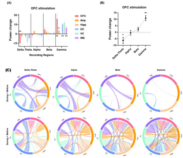 图3. 调控OFC引起不同频段功率重排,情绪脑网络不同脑区信息传递增加