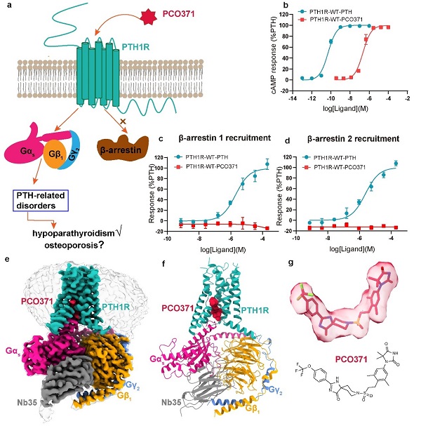 具体地说,PCO371结合在PTH1R与Gs蛋白的胞内界面上,与以前报道的所有GPCR中配体的结合位点完全不同。PCO371作为偏向激动剂,优先通过G蛋白触发信号传递,而非通过阻遏蛋白arrestin。这种偏向性激动剂有助于减少阻遏蛋白arrestin信号通路引起的副作用,提高药物的安全性和有效性(图2)。