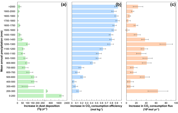为定量评估粉尘“风化度效应”在气候变化中的重要性,基于不同降雨量区粉尘风化程度与大气CO2消耗的定量关系,科研人员计算出末期冰盛期相对与工业革命前,传输到年降水量大于400mm地区的粉尘硅酸盐风化每年至少净增加0.431±0.030Tmol的大气CO2消耗(图3),而该通量已占现今全球硅酸盐风化通量的15%。如果考虑粉尘中碳酸盐矿物溶解对大气CO2的显著消耗以及粉尘风化加强植被作用对风化的正反馈效应,粉尘的“风化度效应”将更加显著。因此,冰期粉尘传输的加强显著提高了陆表的风化度,增强了陆地碳汇,该效应几乎可抵消冰期温度降低对陆地风化速率的抑制作用,使得冰期大气CO2含量维持在低值。
