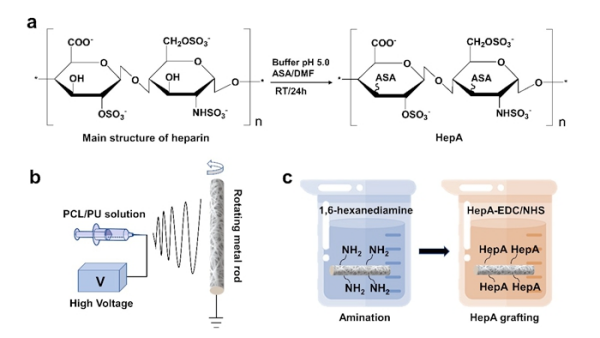 图1. (a)肝素-阿司匹林复合物的合成示意图;(b-c)PCL/PU血管支架制备与HepA接枝过程。