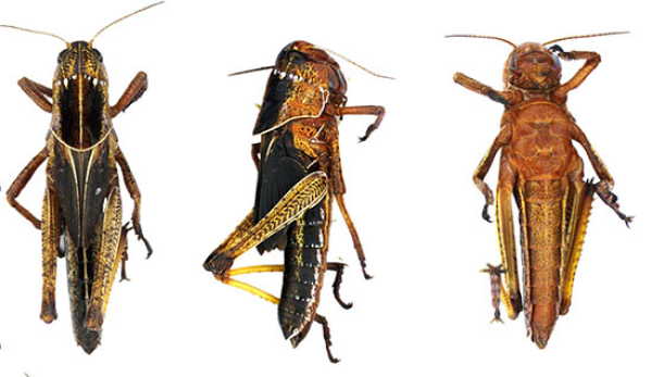 图1. 飞蝗(Locusta migratoria)绿色的散居型(左)和黑-棕色的群居型(右)