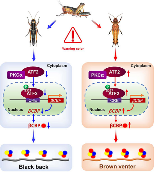 为了探究飞蝗黑-棕警戒体色的形成机制,中国科学院北京生命科学研究院康乐院士团队寻找与警戒体色形成相关的基因,分析群居型飞蝗黑色和棕色表皮蛋白的组成,发现βCBP在飞蝗黑-棕体色的形成中起着关键作用。不同分布量的βCBP-β-胡萝卜素复合物决定了飞蝗黑色背面和棕色腹面的体色差异,其中棕色表皮中的βCBP-β-胡萝卜素分布量显著高于黑色表皮。进而,研究调查了飞蝗体内调控βCBP差异表达的调节因子,发现了bZIP类转录因子ATF2的重要作用。ATF2主要分布在黑色表皮的细胞质中,而在棕色表皮中主要在细胞核中富集,这种定位的差异由ATF2丝氨酸位点磷酸化所导致。进一步,研究通过基因表达、遗传突变和抑制剂处理等实验发现PKC信号通路能够磷酸化ATF2 Ser327并促进βCBP的转录。当研究团队敲降PKCα后,βCBP的表达受到抑制,导致群居型飞蝗的体色由黑-棕警戒色转变成绿色保护色。这种调控机制与飞蝗种群密度密切相关,随着飞蝗种群密度的增加,飞蝗的体色也会发生变化。其中,内在调控过程是PKCα响应高种群密度快速激活并磷酸化ATF2 Ser327,促使ATF2进入细胞核,与βCBP启动子结合并激活其转录。ATF2在黑色和棕色表皮中的磷酸化水平差异导致背面和腹面βCBP的分布量的不同,最终使群居型飞蝗呈现黑色背面和棕色腹面的警戒体色(图3)。