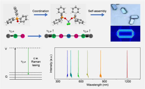 目前,鲜有关于有机材料在连续波拉曼激光方面的研究。有机分子的可设计性为增强拉曼增益系数进而实现连续波拉曼激光提供了机遇。该研究开发出金属-有机配位合成有机二聚体的策略,诱导有机官能团的寡聚效应和刚性效应,可超线性地提高有机分子在金属连接体附近振动模式的拉曼增益系数,为实现有机连续波拉曼激光提供了可能。科研人员选择具有拉曼活性和孤对电子配位位点的三苯基氧化膦(TPPO)作为模型有机化合物,以二价金属卤化物——氯化锌(ZnCl2)作为金属连接体,通过金属-有机配位反应合成有机二聚体(ZnCl2(TPPO)2)。科研人员发展了一种热饱和溶液分子自组装的方法,制备了高质量有机单体和二聚体微晶。相比于有机单体微晶,金属键连有机二聚体微晶展现出显著增强的自发拉曼散射,对应于大幅提高的拉曼增益系数。不同于有机单体微晶,金属键连有机二聚体微晶支持低阈值连续波拉曼激光。同时,相比于有机单体微晶,金属键连有机二聚体微晶具有更高的稳定性,可确保连续波拉曼激光器长时间稳定运行。受激拉曼散射作为一种三阶非线性效应本身支持激光波长调谐。且有机二聚体微晶具有大的光学带隙,展现出非常宽的透明窗口(360~1580nm)。因此,科研人员通过调控激发光波长,在有机二聚体微晶中实现了可见-近红外范围内多个波长的激光出射(422、465、562、678、852、1190nm)。金属键连有机二聚体策略可显著提升有机分子拉曼增益系数和有机微晶材料稳定性,为探索有机连续波微纳激光器提供了新平台。