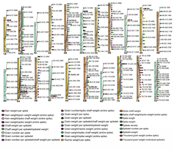 中国科学院植物研究所郭自峰研究组利用来自世界范围内的306份小麦约4千万的SNP,对穗长、穗重、籽粒重、千粒重、小穗数、芒重、糠重等27个穗部性状进行全基因组关联性分析,鉴定590个关联的区段。研究发现,穗子的间接性状具有更强的峰值,因此通过间接性状的方法来鉴定出强关联信号的方法是可行的。进一步,科研人员利用同化物分配性状的GWAS结果鉴定到TaSPL17为调控相关性状的候选基因。分析发现,TaSPL17通过调控小穗和小花分生组织的发育来控制籽粒的大小和数量,进而提高单株籽粒产量。生物信息学分析表明,TaSPL17的单倍型具有明显的地理分布差异,且受到驯化和育种选择。该研究为小麦穗部性状的研究提供了高密度的遗传图谱,为穗部形态的遗传改良提供了宝贵资源,并为小麦候选基因检测和克隆提供了快速的遗传解决方案。