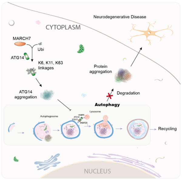 近日,中国科学院广州生物医药与健康研究院张小飞团队在《细胞报告》(Cell Reports)上,发表了题为MARCH7-Mediated Ubiquitination Decreases the Solubility of ATG14 to Inhibit Autophagy的研究论文,揭示了E3泛素连接酶MARCH7通过泛素化修饰ATG14抑制自噬,导致蛋白聚集体通过自噬途径降解受阻的机制。
