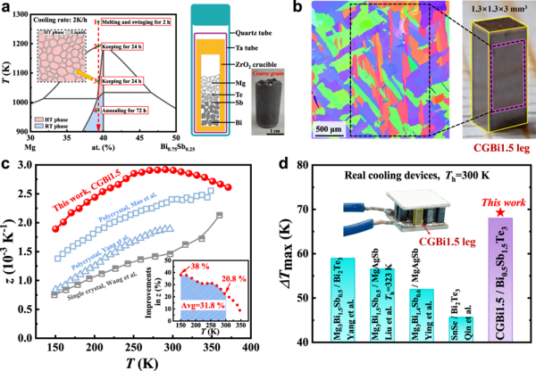 图1. a、赝二元Mg-Bi0.75Sb0.25相图的示意图、合成步骤及三层嵌套坩埚装置,右侧为合成的多晶块体的照片;b、所得Mg3.15Bi1.4975Sb0.5Te0.0025粗晶(Coarse grain,CGBi1.5)样品的电子背散射衍射(EBSD)图像,以及作为对比的单个CGBi1.5热电臂的照片;c、CGBi1.5样品的z值与文献数据的对比,插图为相对文献最高值的提升百分比;d、在新材料体系热电器件中CGBi1.5/Bi0.5Sb1.5Te3 热电器件的制冷温差优势。