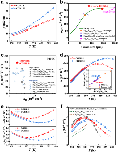 图2. Mg3.15Bi1.4975Sb0.5Te0.0025(CGBi1.5)和Mg3.15Bi1.2475Sb0.75Te0.0025(CGBi1.25)的热电性能。a、电阻率随温度的变化趋势;b、n型Mg3(Bi,Sb)2材料体系的载流子迁移率与晶粒尺寸的关系;c、 CGBi1.5的加权迁移率与文献值比较;d、塞贝克系数随温度的变化趋势,插图为根据塞贝克系数估算的材料带隙;e、总热导率和晶格热导率随温度的变化;f、与文献n型碲化铋基材料的z值比较。
