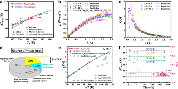 图4. CGBix/Bi0.5Sb1.5Te3(x=1.5, 1.25)镁基热电模块的制冷和温差发电性能。a、不同热端温度下,CGBix/Bi0.5Sb1.5Te3(x=1.5, 1.25)模块与商用Bi2Te3模块最大制冷温差比较;b、 CGBi1.5/Bi0.5Sb1.5Te3模块的制冷功率密度(qc)随电流的变化规律;c、CGBi1.5/Bi0.5Sb1.5Te3模块在不同温差下的COP曲线;d、工业余热分布,其中T < 473 K的余热(主要是冷却介质,废水和蒸汽)约占31%;e、CGBix/Bi0.5Sb1.5Te3 (x=1.5, 1.25)模块的能量转换效率;f、CGBi1.5/Bi0.5Sb1.5Te3器件的最大制冷温差和CGBi1.5样品电阻率的稳定性情况监测。