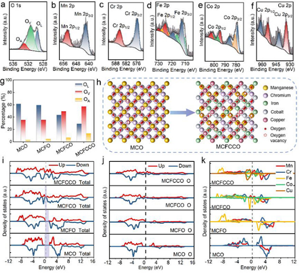 近日,该团队通过理论与实验相结合的方式,进一步阐明了高熵氧化物的微观结构、元素组分、电子分布与红外辐射性能的构效关系,揭示了高熵工程对材料红外辐射性能提升的内在机制。结果表明,高熵策略产生的轨道杂化可有效增强电子跃迁几率,通过变价金属元素引入大量氧空位,从而减小材料的带隙(图1)。同时,晶格畸变效应降低了晶格振动的对称性。因此,(MnCrFeCoCu)3O4高熵尖晶石氧化物具有优异的近黑体辐射能力。经1300°C退火热处理100h后,材料仍保持单相尖晶石结构,红外辐射衰减率仅为2.1%(图2)。