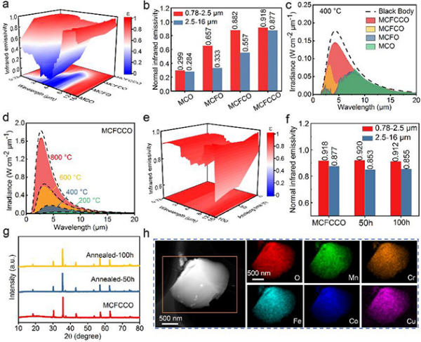 中国科学院兰州化学物理研究所清洁能源化学与材料实验室低碳能源材料组高祥虎研究员团队在新型高温红外辐射材料的设计与制备方面开展了系统研究。针对传统尖晶石氧化物在短波长红外区域发射率低、热稳定性不佳的问题,研究提出了利用高熵概念进行材料性能优化设计。科研人员通过简便、低成本的固相合成反应,制备出(CuMnFeCr)3O4尖晶石型高熵氧化物红外辐射材料,重点研究了高熵多主元设计对材料红外辐射性能和高温热稳定性的影响。结果表明,多主元设计可有效提高0.78-2.5μm和2.5-16μm波段的红外发射率,且高熵效应利于长效的化学热稳定性。