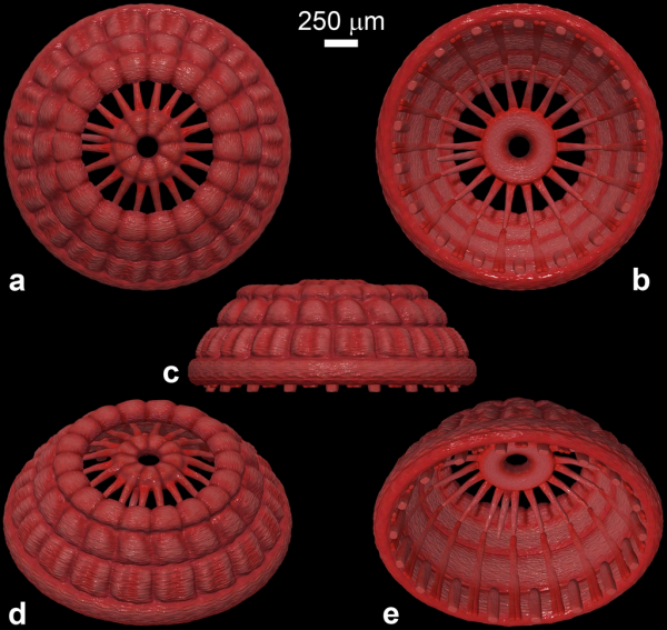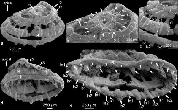 本研究共报道了3枚标本,均为毫米大小。其中,1枚(NIGP179459)保存较好,呈现“五环”状结构,从顶到底由5个直径逐渐增大的环组成。第1环和第2环同圆心且共平面,且它们之间有明显的空隙。第2到第5环紧密贴合,形成圆台状结构。第1环与第3环之间通过19条辐射状结构连接,第3环和第5环之间有36条纵向结构连接。躯体末端具有辐射对称结构的生物只有环神经动物,而其他两侧对称动物的末端的纵肌多为两侧对称排列。