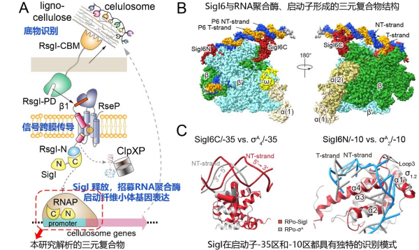图1. 通过结构解析揭示SigI因子识别启动子的机制。(A)SigI-RsgI通过感应底物调控纤维小体转录的机制;(B)包含SigI6的转录开放复合体的冷冻电镜结构;(C)SigI6对启动子-35和-10区的识别方式。