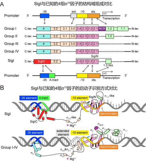 图2. SigI因子具有和已知的4组σ70家族σ因子不同的结构域组成和启动子识别方式。