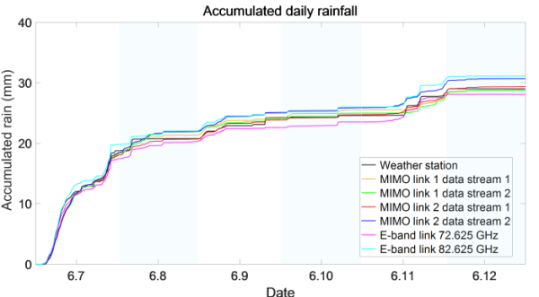 LOS-MIMO和E频段毫米波链路反演的累积日降雨量与气象站测量数据的对比
