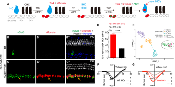 图1.A、内毛细胞损伤再生的示意图;B、内毛细胞损伤小鼠模型可以高效特异的损伤内毛细胞;C、在内毛细胞损伤的情况下,异位表达Atoh1与Tbx2可再生出vGlut3+的新生内毛细胞;D、损伤情况下的再生毛细胞效率显著提高;E、转录组水平上,新生毛细胞与野生型P30内毛细胞聚为一群;F-G、新生内毛细胞的电压依赖的Ca电流与野生型内毛细胞相似。