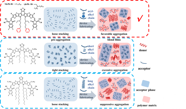 Y6-Ph和L8-Ph的化学结构以及具有不同内侧链的小分子受体在较长时间成膜过程中的聚集行为示意图
