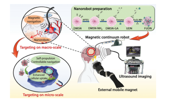 机器人系统由磁驱动连续体微型机器人、生物相容性微纳机器人以及外部驱动、成像设备构成。连续体微型机器人首先经过颅骨微创通道进入颅内,越过血脑屏障抵达胶质瘤部位,实现宏观尺度的一级靶向。进而,微纳米机器人经过连续体机器人内部通道到达胶质瘤病灶,并在外场驱动下向肿瘤内部运动及释放药物,实现微观尺度的二级靶向。