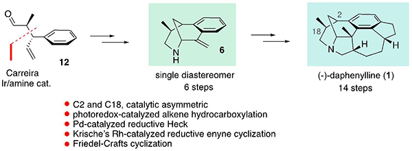 (-)-Daphenylline是由昆明植物所郝小江院士团队2009年从长序虎皮楠中分离得到含有迄今为止唯一一个具有苯环6/6/6/5/7/5六环稠合的虎皮楠生物碱,分子中具有氮杂二环[3.3.1]壬烷结构单元,6个手性中心,其中一个是全碳的季碳中心。如何快速构建其骨架并精确控制手性中心,成为了该生物碱全合成工作的主要难点。2013年,中国科学院上海有机化学研究所研究员李昂团队利用6π电环化为关键,首次完成了daphenylline的全合成。该明星分子陆续被四个国内外研究组报道过全合成,其中两个研究组更是运用不同策略两度报道该天然产物全合成。