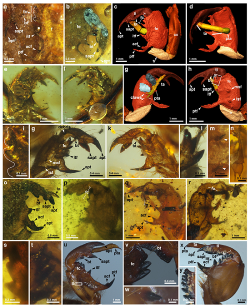 进一步,该研究报道了白垩纪中期蝉总科末龄若虫和蝉蜕化石,这是目前已知最早的蝉总科末龄若虫化石记录。它们具有与现代蝉若虫相似的前足,呈镰刀状胫节与扩张膨大的股节相契合形成抓握结构。这表明它们具有强大的土壤挖掘和运输能力,可能演化出与现代蝉若虫类似的地下生活习性。化石若虫具有明显增大、膨胀的前唇基和后唇基,且两侧肌肉痕明显,以及长刺吸式口器。这与蝉总科现生类群的唇基和口器形态相似,表明它们可能已演化出强大的食窦肌,能够克服负压和刺穿植物木质部导管以吸取木质部汁液为食。