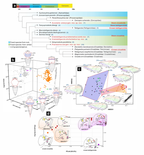 由于保存问题,昆虫化石的分类通常依赖于保存下来的部分形态特征。本研究对蝉的成虫和若虫的局部结构进行了形态空间分析。研究基于主成分分析、非度量多维尺度分析和主坐标分析等方法量化降维特征数据,通过比较局部形态变化和系统发育的结果,发现蝉科化石中高度特化的同源结构可能包含先前忽略的过渡特征。