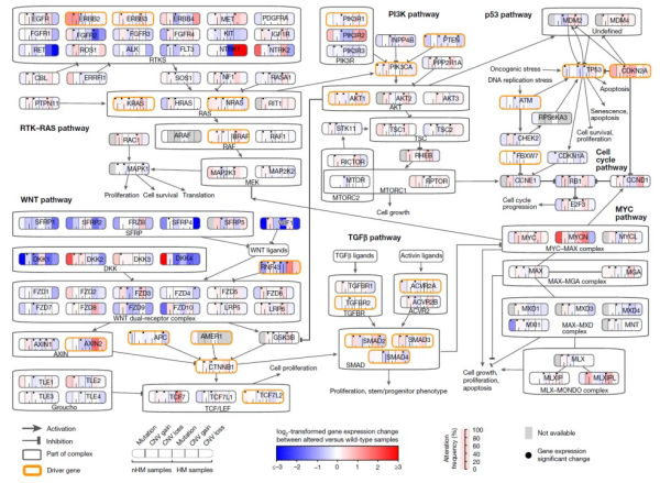研究团队利用同一肿瘤样本的基因组和转录组数据对突变基因和基因表达水平进行了整合分析,验证了RTK-RAS、PI3K、P53和TGF-β通路相关基因EGFR、KRAS、PIK3CA、CDKN2A、TGFBR1和ACVR2A的突变与基因表达增加有关,而无论是否为MSI肿瘤,其抑癌基因APC、PTEN和TP53上的突变均导致基因表达降低。