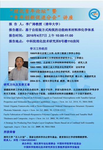 应“理化青年论坛”暨理化所青促会和理化所仿生智能界面科学实验室邀请,清华大学李广涛教授将来理化所交流访问,并作学术报告。诚挚欢迎感兴趣的老师和同学们参加学术报告会。